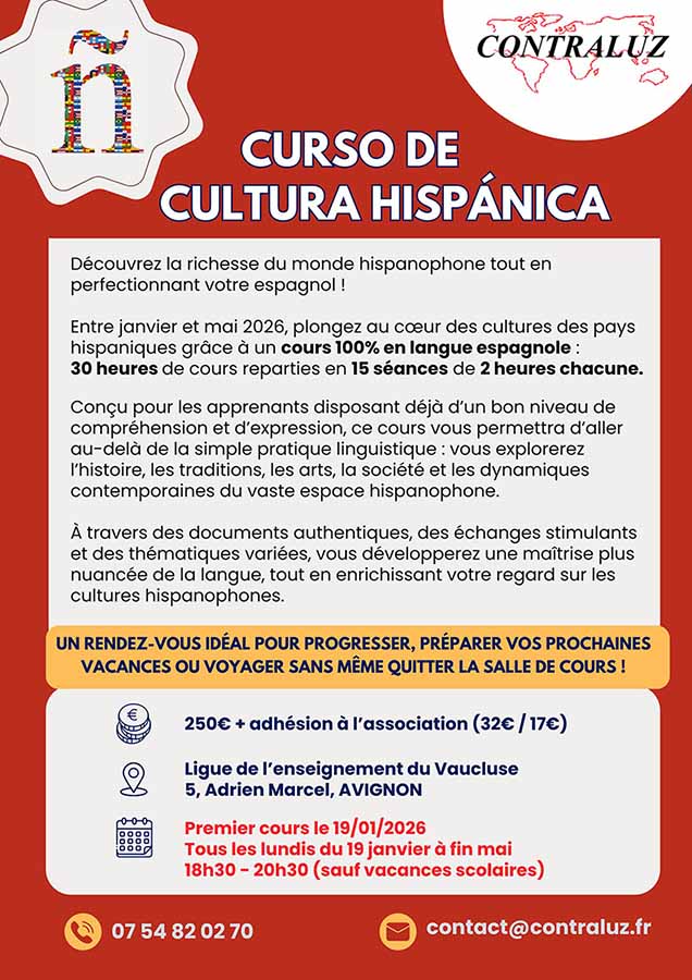 IMPORTANT – Suite à un problème d’ordre technique, nous n’avons pas pu commencer notre Curso de Cultura Hispánica ce lundi 19 janvier. Le premier cours est donc reporté au lundi 2 février prochain.
