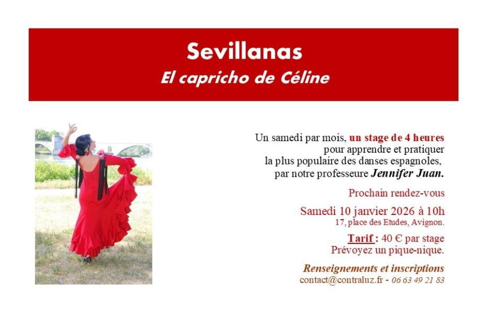 Sevillanas – El capricho de Céline – samedi 10 janv à 10h 6 janvier 2026 contraluz Cours 0 Les cours de Sevillanas se poursuivent. Toute l’année, nous allons toucher, par la danse et la musique, le cœur de l’âme espagnole. La prochaine séance aura lieu le Samedi 10 janvier à 10h
